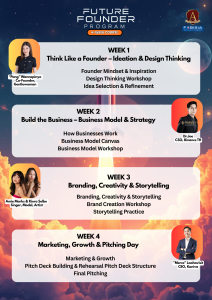 Students will learn how to think like real founders, build business ideas, and pitch with confidence, guided by experienced mentors and exclusive guest speakers every week.